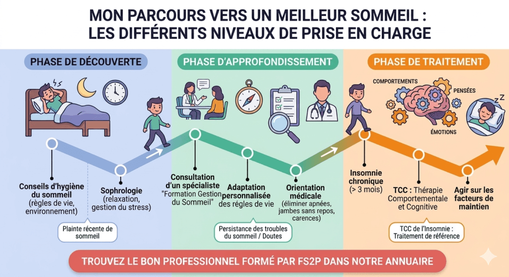 Le premier niveau repose sur l’application de conseils en hygiène du sommeil, où la sophrologie trouve également toute sa place pour vous accompagner. Si cette étape ne suffit pas, il peut être utile de solliciter un professionnel disposant de connaissances approfondies (Formation : Gestion du sommeil). Ce dernier pourra vous aider à adapter les règles d’hygiène à votre profil et à votre mode de vie spécifique.